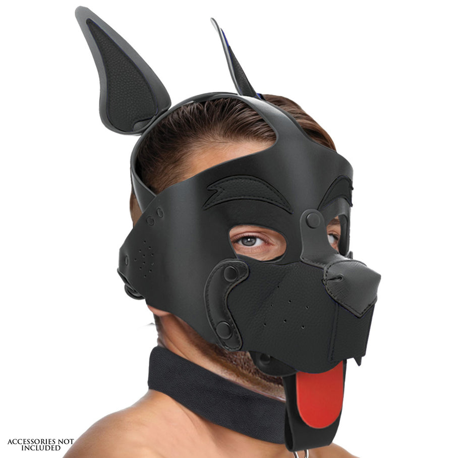Once the hood and muzzle is on, you'll become the playful pup! Step into the role of an obedient or dominant pup with the Alpha Dog Pup Hood. Perfect for playful puppy transformation, this hood boasts large eye holes, ensuring clear visibility. The design features a strap down the scalp for securely placed ears and a breathable design that shows off your natural hair. The realistic nose design and removable red tongue and muzzle provide practical flexibility for playful scenes. Crafted from vegan leather, it maintains a genuine look while being easy to maintain. Suitable for various head sizes, this hood offers an accessible and fun experience for human-animal play enthusiasts.