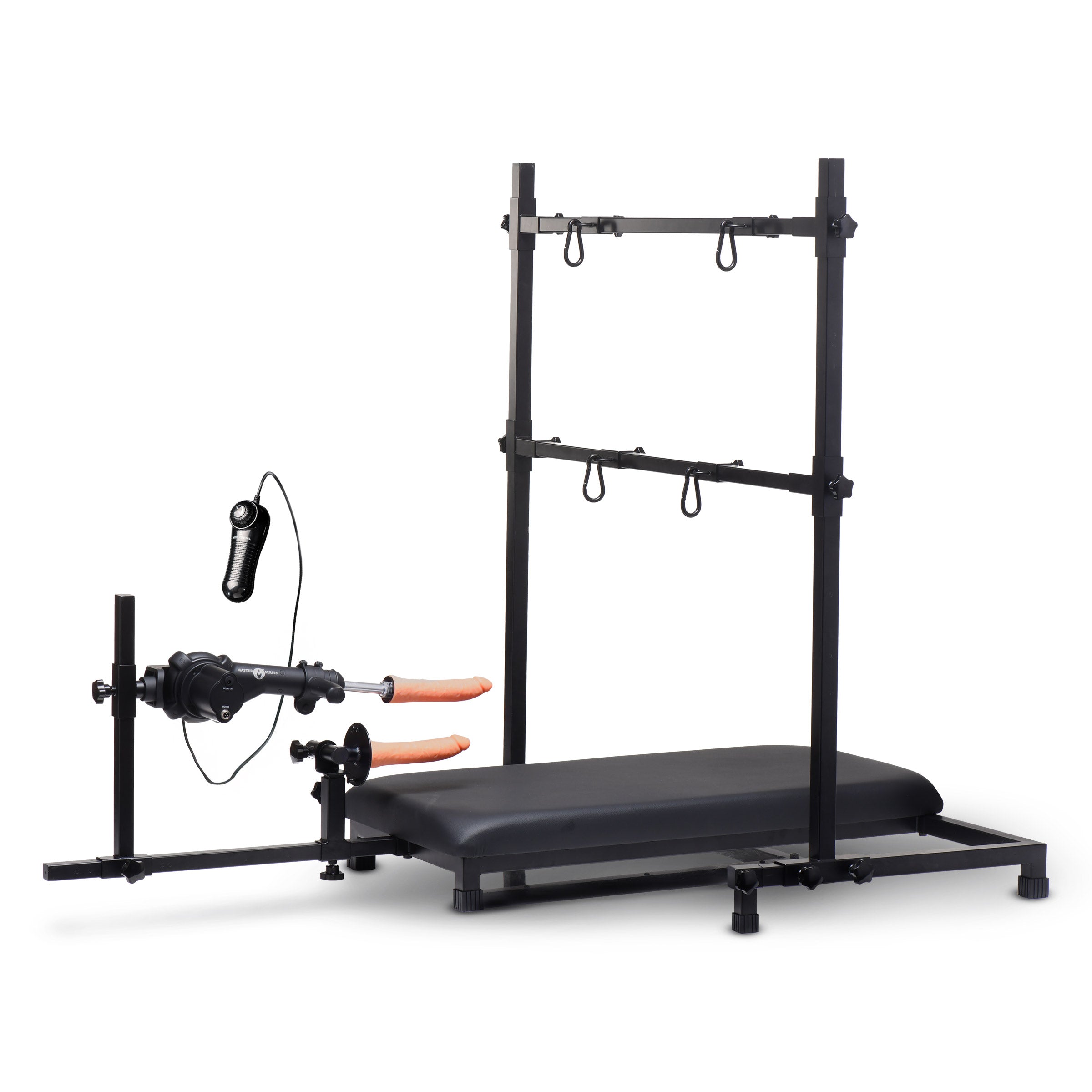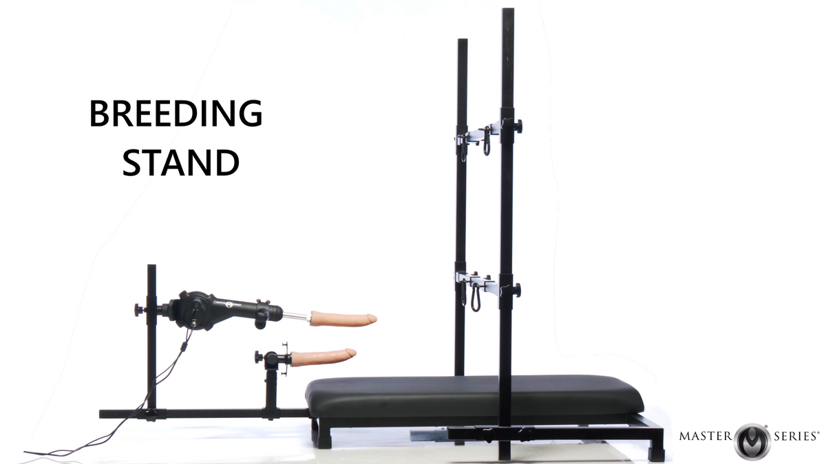 Fully surrender to limitless pleasure with our Breed Master Breeding Stand with Sex Machine provides a stable steel base and a solid wood platform covered with smooth, easy-to-clean, vegan-leather to keep comfort front and center. The multi-speed sex machine lets you fine-tune every moment with precision as your desires demand faster and harder, or slow and steady. And because everyone deserves flexibility, the sex machine can transform into a handheld device when the mood strikes. Fully adjustable arm and leg bars create endless possibilities, embracing every body type while meeting your every need. Complementing your experience is a premium silicone dildo, made to deliver unparalleled pleasure safely. Wrist and ankle clips allow you to suspend your arms and legs, inviting full surrender with a 28-inch spacing option for optimal restraint. Plus, the added stationary dildo adapter allows seamless customization, supporting Vac-U-Lock or suction cup options for those who want to explore double penetration while restrained. Set up to cater to your fantasies, built to maximize your pleasure.