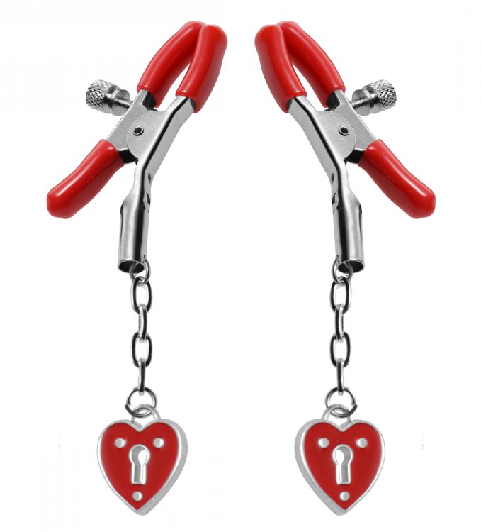 These nipple clamps are designed to be effective when giving your partner a good squeeze. These clamps are also decorated with heart-shaped padlock details. The tips of the clamps are coated for a secure and comfortable grip. The clamps are tightened using the screws on the side. The heart accent will be visually stimulating for everyone involved.