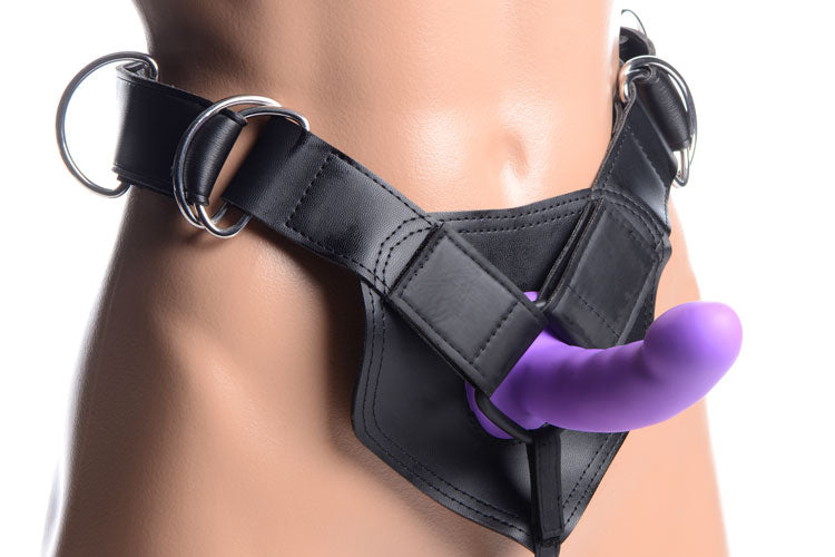 This strap-on features a fully-adjustable harness with customizable straps for the waist and crotch. Put the curved dildo into place, and you're prepared to pound your partner. There are three incldued O-rings so that you can find the right fit, or include your favorite strap-on dildo. The curve of the included dildo is ideal for targeted G-Spot and Prostate stimulation.