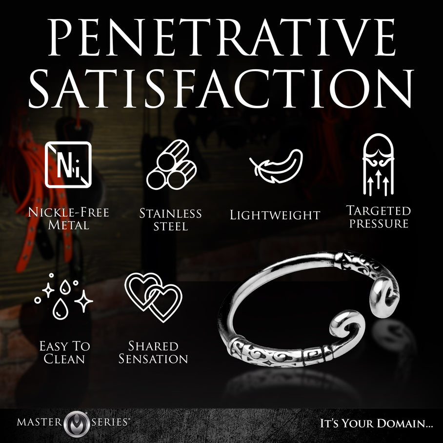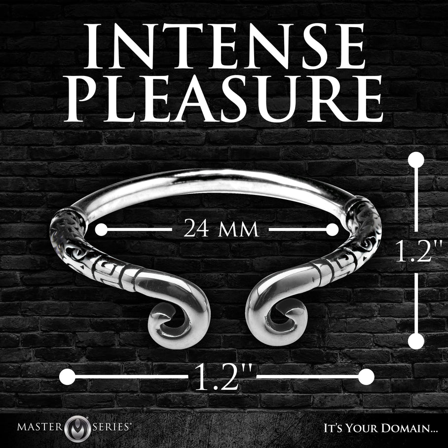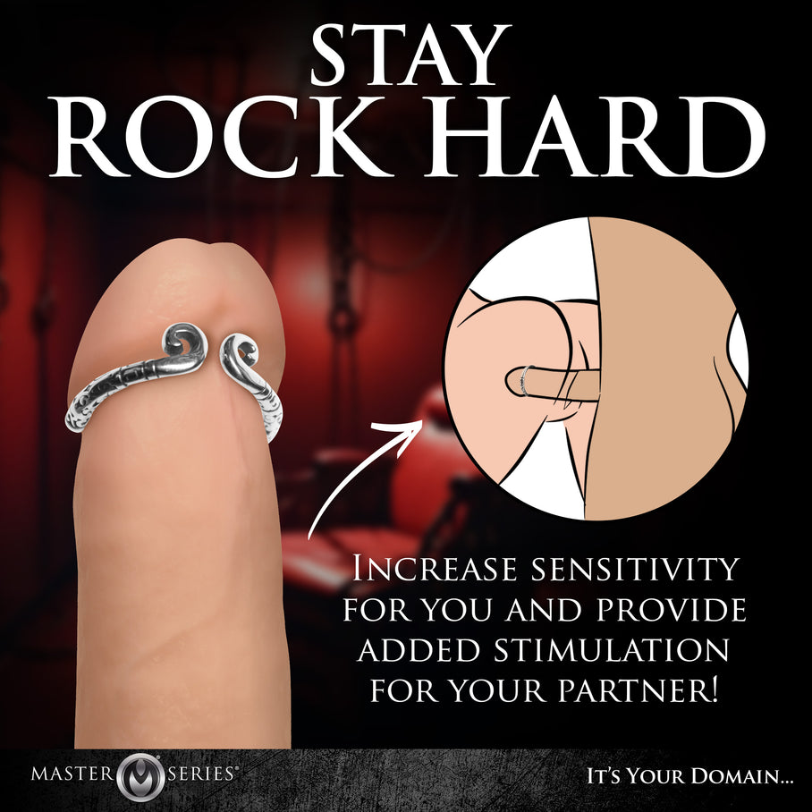 When you wear this Kingpin Glans Ring on your mighty rod, you're not only improving the look of your dong, you're also enhancing sensation in the head! This temperature-sensitive, open and adjustable ring fits perfectly on the head of your shaft, right below the corona. The pressure enhances sensation as it keeps the blood in the tip. Made out of nickel-free, stainless steel it is body-safe and long-lasting. The curved arms have unique designs on the metal that both you and your partner will enjoy! Do not use it during anal or you risk losing the ring! To clean, simply wash with mild soap and water. Works well with intact and circumcised men.