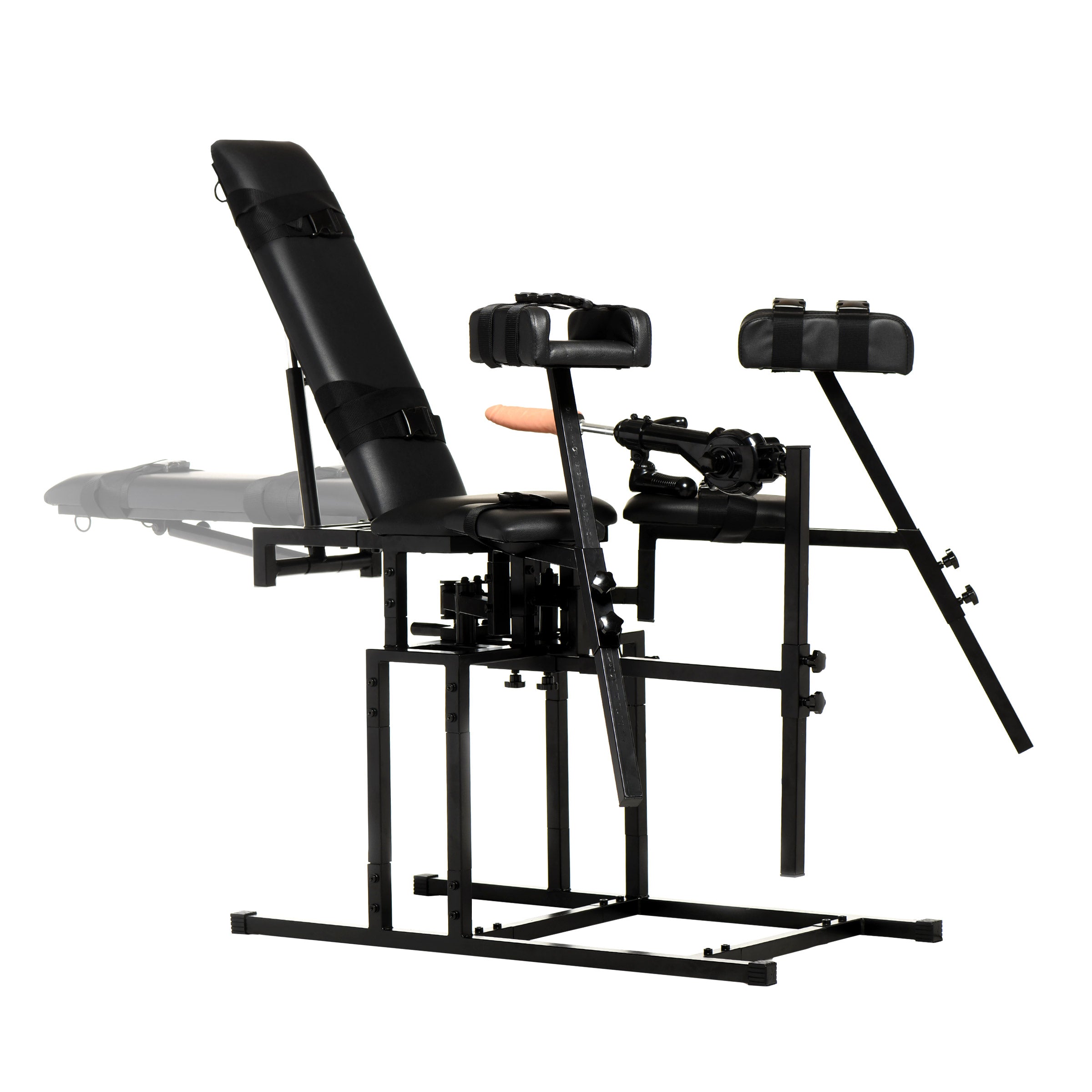 Half Reclined (Male, Pegging): Bring their hips to the very edge of the chair. With the chair in a 45 degree angle, bind their chest and waist with the straps and bring their hands over the head by attaching cuffs to the D-rings on the chair. Their legs are strapped in so they're completely at your mercy! Play with them to get them excited; use a stroker, vibrator, or your hand to tease them. Play with their nipples and use nipple clamps. Use a paddle, slapper, crop or flogger to punish and play with them. You can even try out some e-stim and see how much you can get them to writhe and struggle in the chair! Then use the sex machine to pound their backside or enjoy doing the deed yourself!