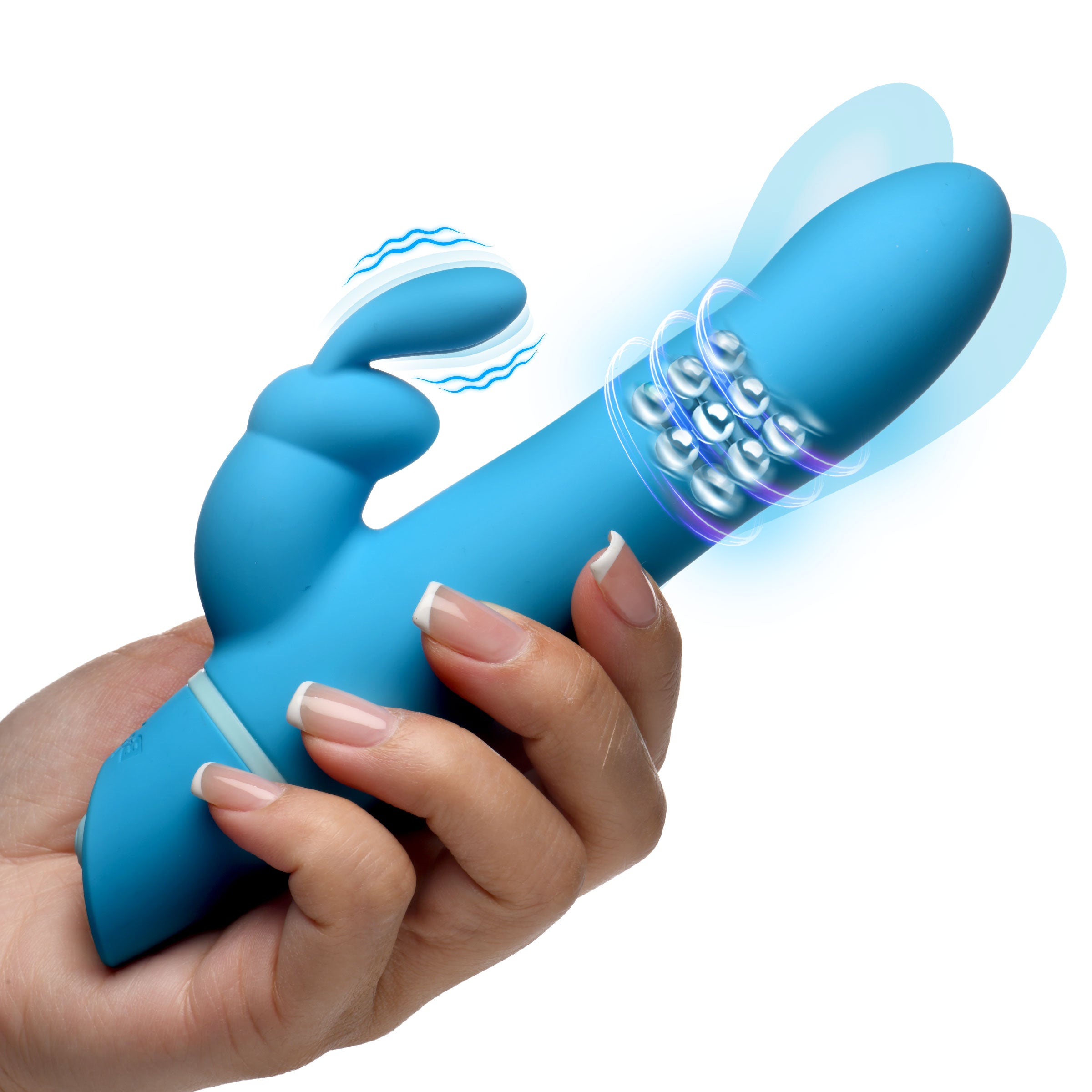 The gyrating tip curves naturally toward the G-spot and maintains contact with it as the toy operates, working with your anatomy rather than against it. Three rows of rotating metal beads run along the 4.2" insertable shaft and add a rolling, massaging internal sensation against the vaginal walls that many women describe as genuinely different from vibration alone. The firm dual bunny ears rest comfortably against the clitoris and the dedicated bullet provides focused pinpoint vibration exactly where the majority of women need direct stimulation most. Five modes of shaft rotation and five modes of clitoral vibration each operate independently, so you are in complete control of your experience at every moment. Made from soft, silky-smooth phthalate-free hypoallergenic silicone. USB rechargeable. Splash proof for effortless cleanup.