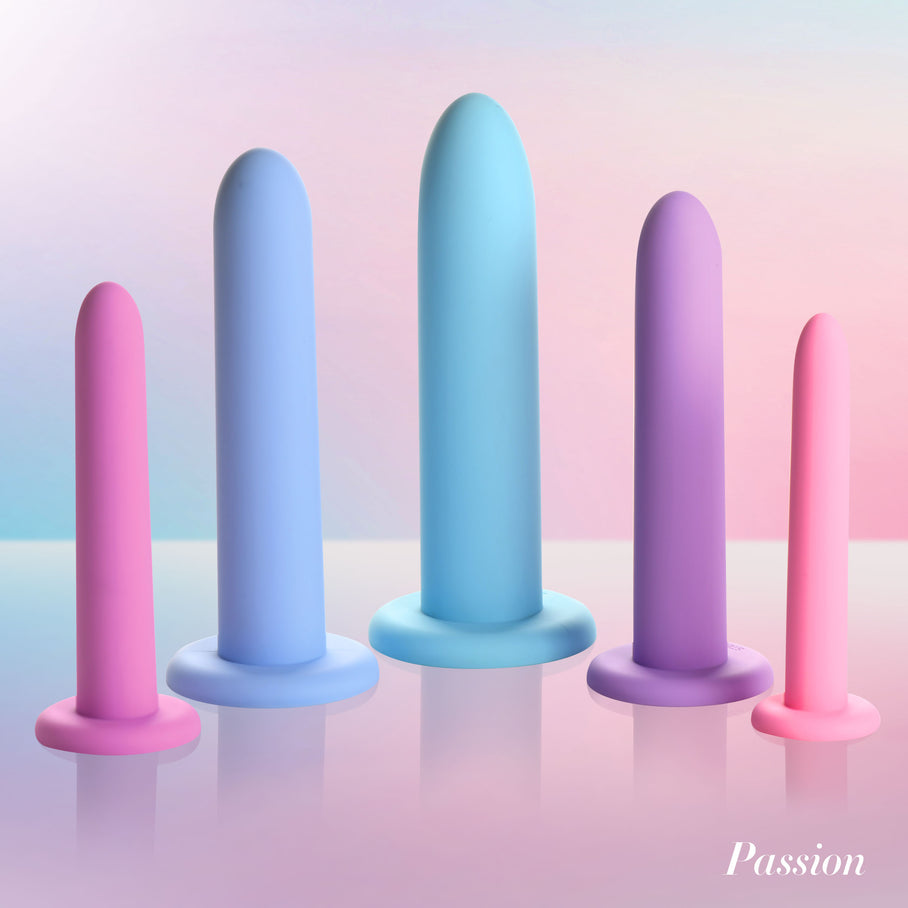 Explore new levels of intimacy and trust with our body-safe silicone pelvic dilators. Each piece is made from high-quality, silky smooth silicone that effortlessly glides in with the help of a water-based lubricant. Start with Step 1 and gradually progress to Step 5, boosting your confidence and control as you go. The tapered, smooth tip ensures a gentle and easy insertion experience every time. Designed with a convenient suction-cup base, these dilators can be used hands- on any flat surface, offering versatility and ease of use. Perfect for those who feel pain during penetration, this set gently stretches the pelvic floor muscles, providing a soothing release of tension. Take the next step in your intimate journey with care and compassion.