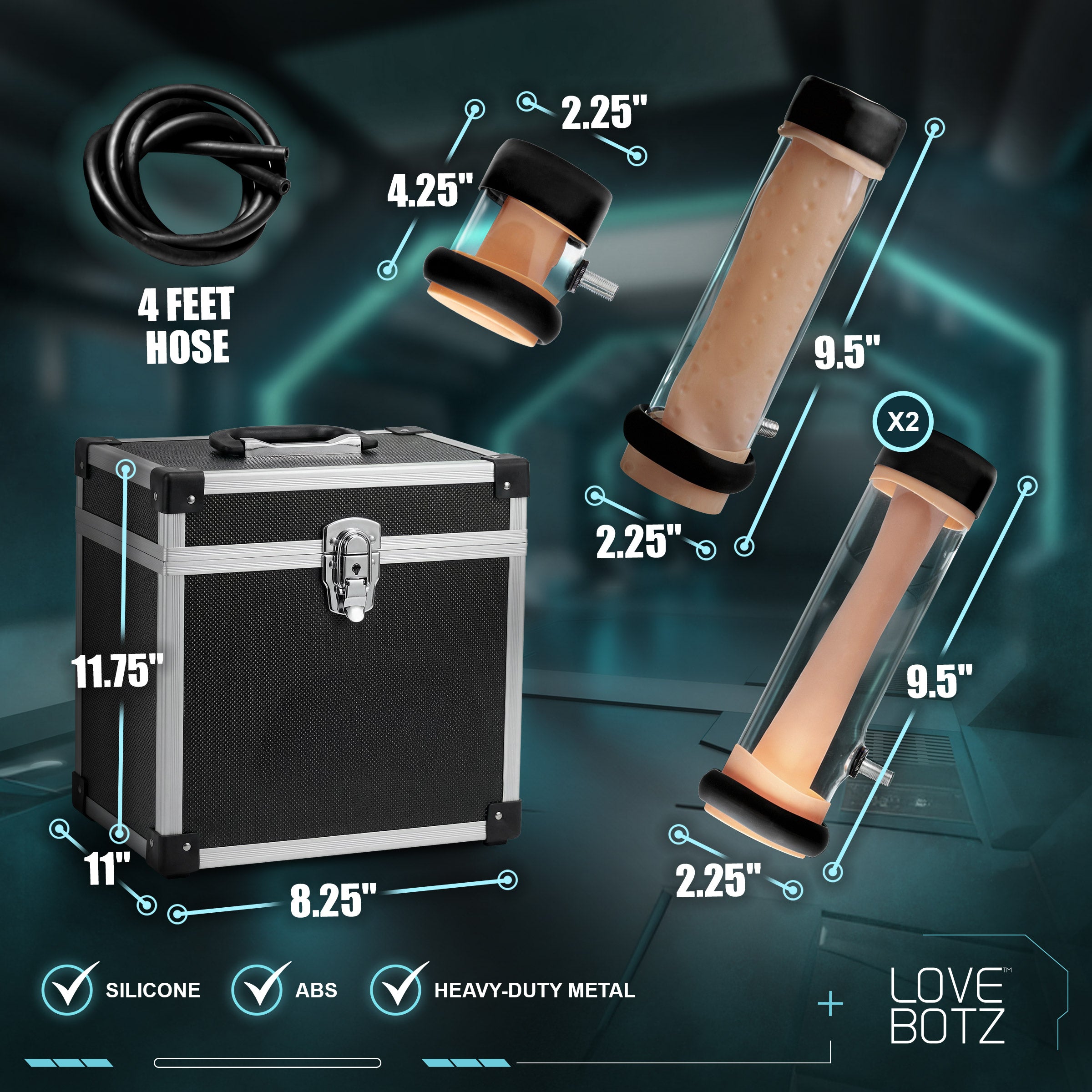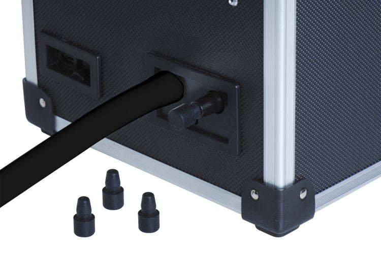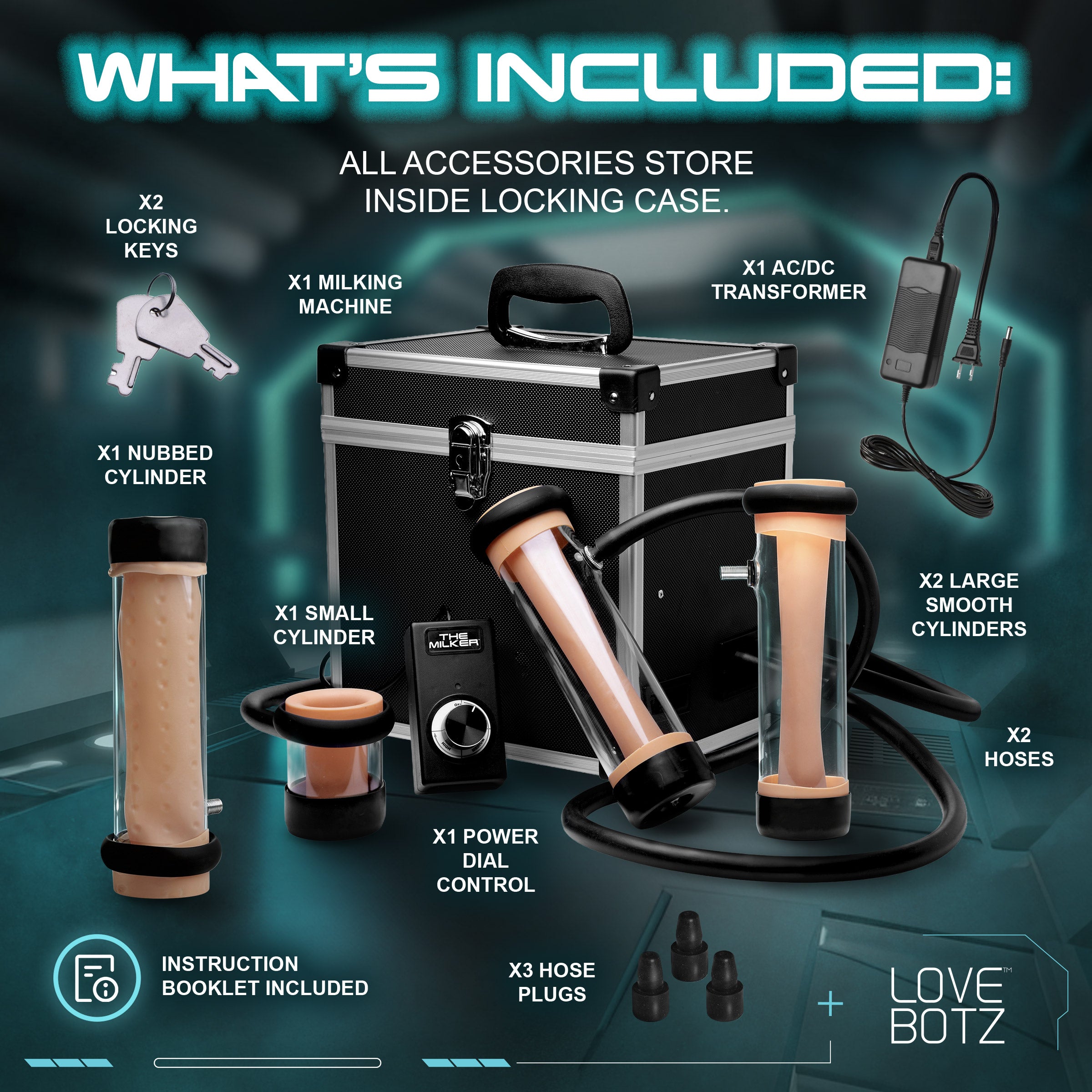 - Note: Includes machine, 2 hoses, 3 hose plugs, 2 large smooth cylinders, 1 large nubbed cylinder, and 1 small cylinder, power dial control, 2 locking keys, ACDC transformer, US power cable, and instructions. Compatible with our voltage adapter for overseas orders.