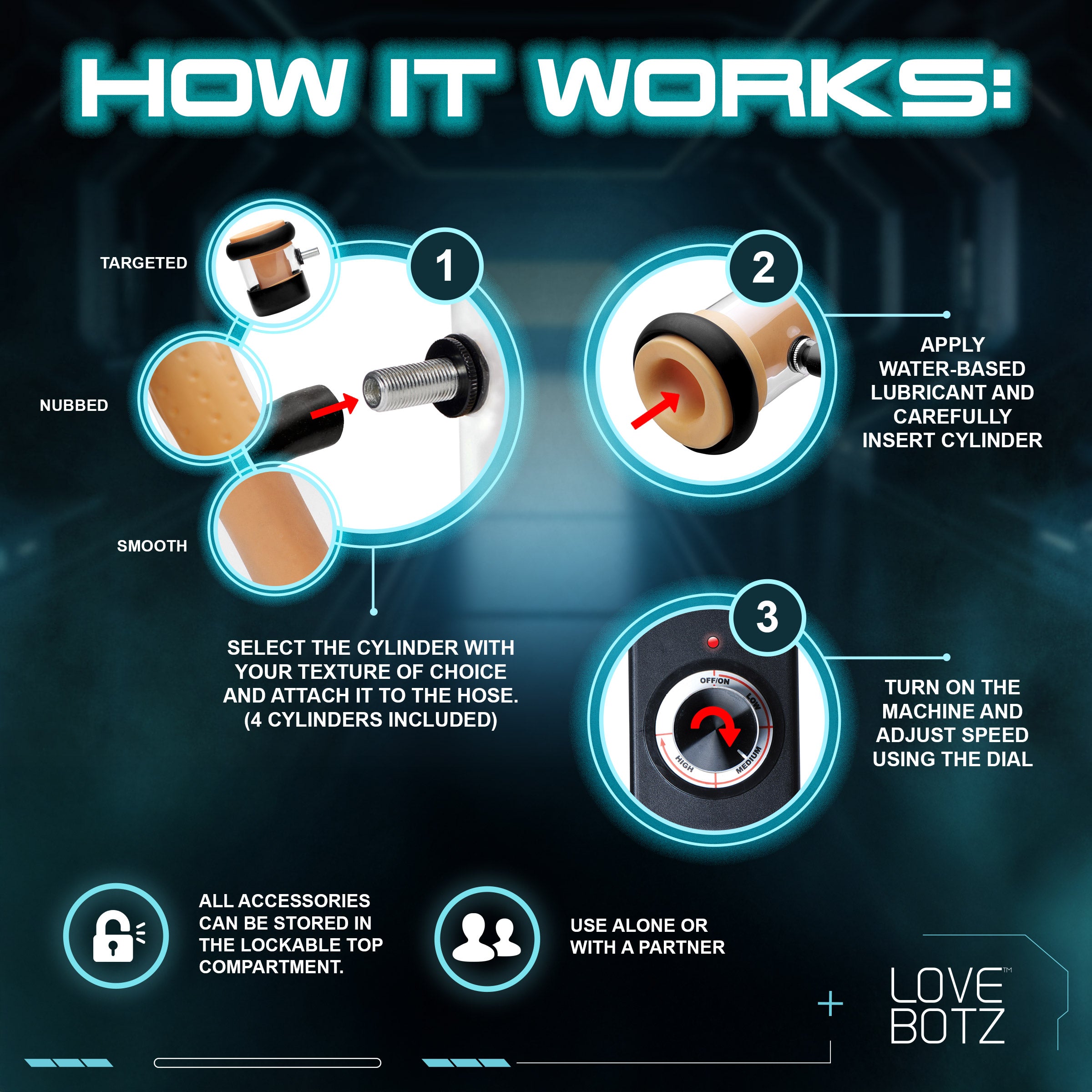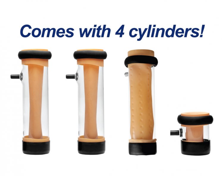 Now with a total of 4 stroker cylinders, this update on our popular Milker Machine is better than ever! The multi-speed machine houses everything you need discreetly in the top. Just plug a hose into your cylinder of choice and use the dial to control how fast or slow you want it. Three different kinds of cylinders are included. The first is specially designed to suck your shaft, at nearly 9 inches long and lined with supple rubber for a tight seal. It feels so good that we've included 2 of them in case you wear out the first! We have also included a textured cylinder, lined with tantalizing nubs that will massage your dick as it's sucked. Finally, the smaller cylinder is for more targeted pleasure, such as your cock head or even the clitoris or nipples. Use this milking machine alone or with a partner, for foreplay, solo play or anything you can dream up. It's like a blowjob, except you can have it whenever you want!