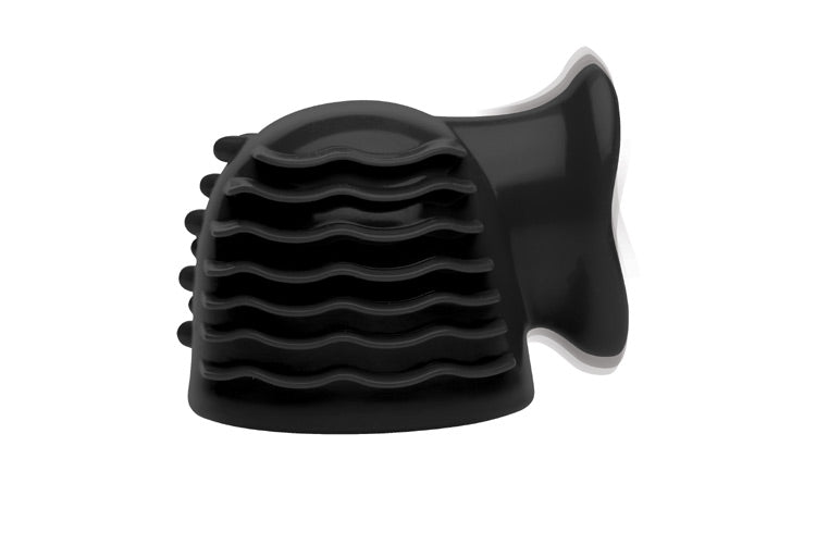 How much ecstasy can you endure before you explode with orgasm? This accessory fits onto the head of your vibrating wand and adds three exciting textures for you to play with. Explore elevated ecstasy with dozens of sensual nubs. Revel in rippled ridges that gently tease your most sensitive areas. A surprise waits for you in the cup on the front: inside, a small tongue will flicker with the vibration, simulating the delightful and delicate licking of oral sex. This attachment is great for orgasm denial or forced orgasm with a partner, but makes a great solo accessory as well. Made of quality silicone, the Thunder-Gasm is non-porous and phthalate-free. Clean with mild soap and warm water and keep away from silicone lube.