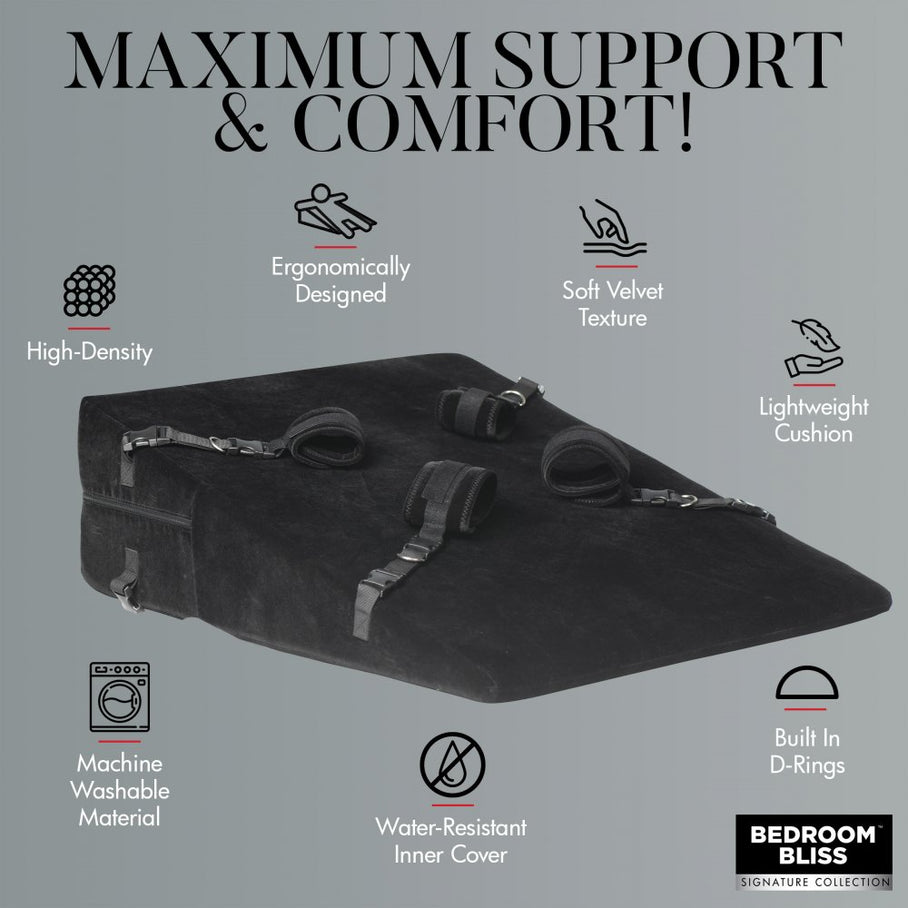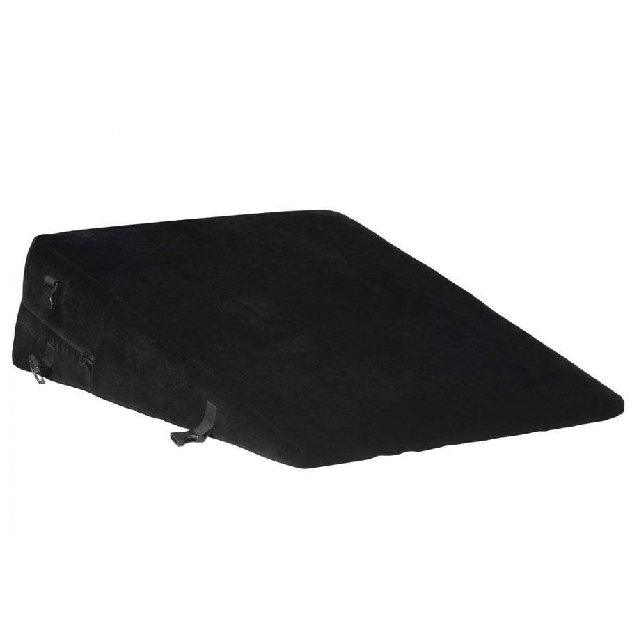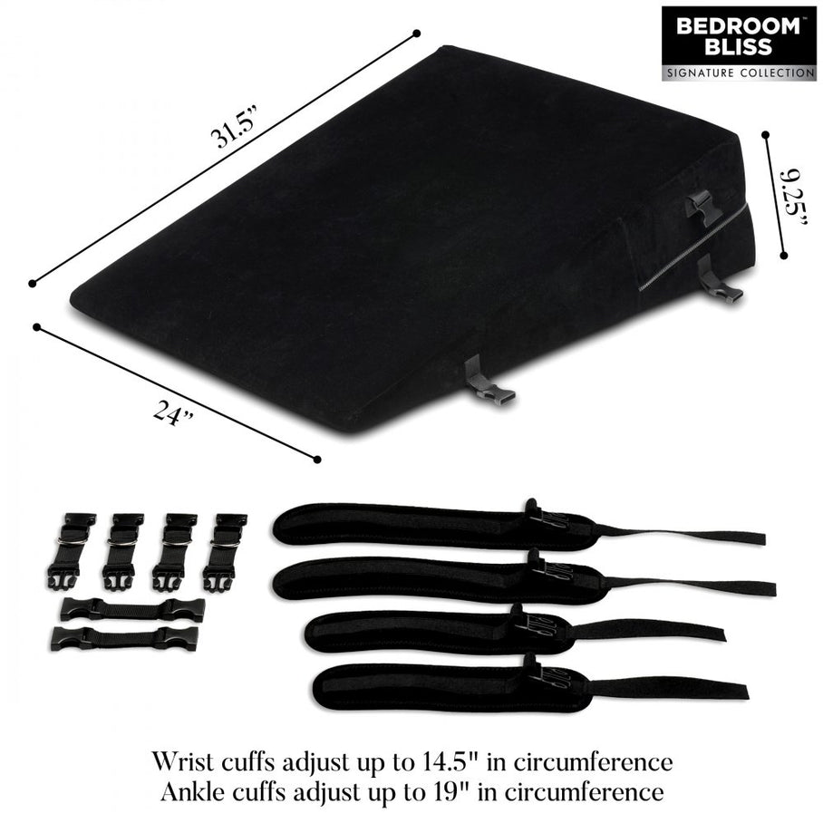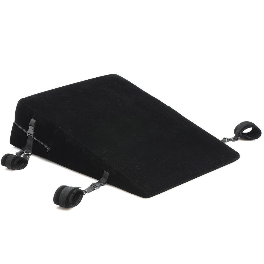 Indulge in your darker desires with this large, high density foam wedge-shaped pillow! With 2 wrist cuffs, 2 ankle cuffs, 4 connectors and the 2 restraint connectors attached to the pillows you can make your kinky bondage play simple, fun and physically supported! Combine your favorite devious activities with clever positioning that makes it so you and your partner can indulge in longer, kinkier roleplay! Just because it's kinky doesn't mean it has to be uncomfortable! You can choose what kind of delightful pain to enjoy while comfortably kneeling or laying on the firm, supportive cushion. This large wedge shape can be used with a smaller pillow for countless configurations or alone to support key positions to satisfy you or your partner. You can elevate their hips, support their chest or head, bend them over in Doggy style, or use it as a backrest for face-to-face intimacy as you ride your partner! Keep their wrists and ankles cuffed as you use the pillow and enjoy how their own body-weight keeps them bound as you both kneel or lay on the pillow, keeping them in place! The pillow also makes oral easier, too! Enjoy worry-free sensual play with dual protective layers that are machine washable. The velvety outer layer is soft against your bare skin and the water-resistant inner layer keeps the pillow moisture and mildew-free.